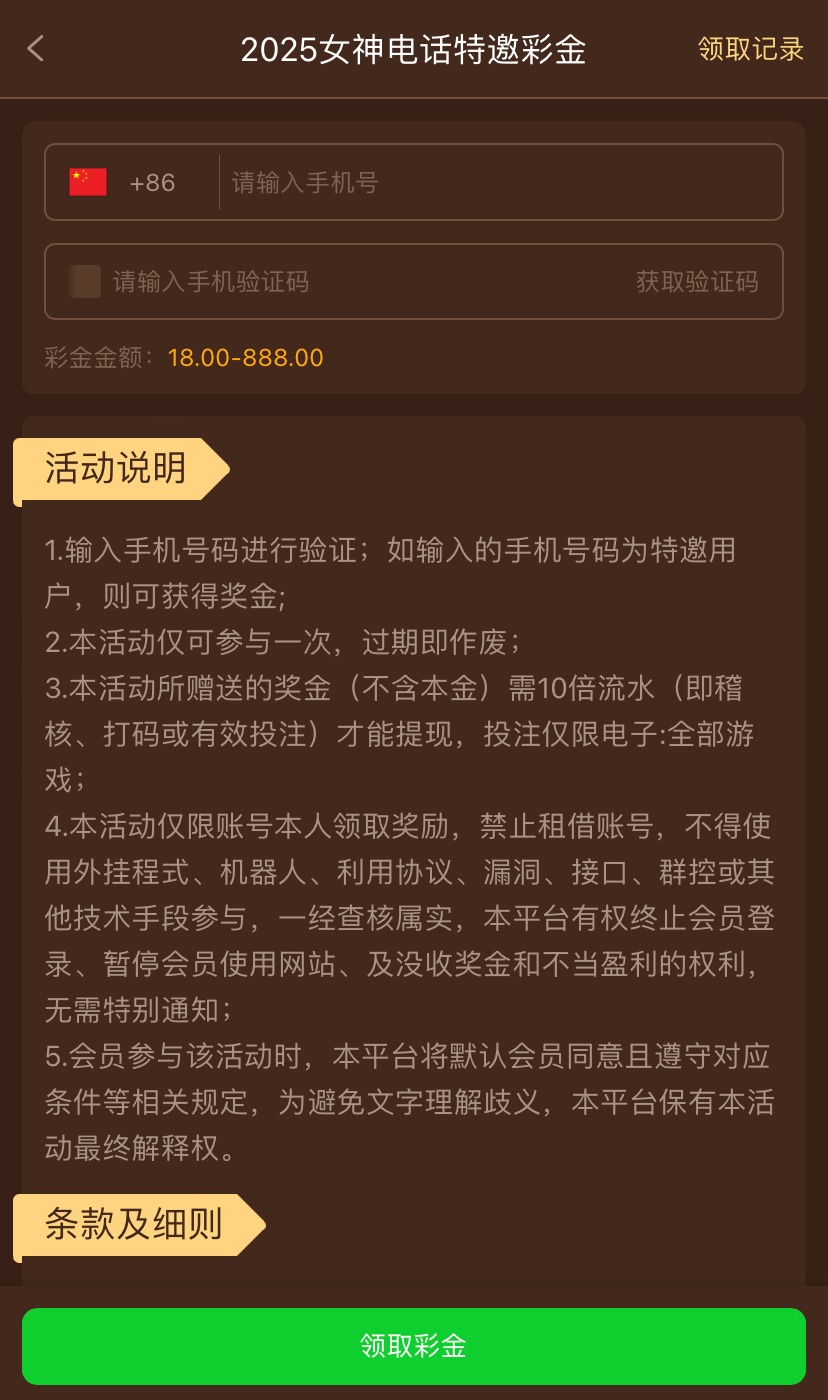 之前特邀领88重置了可以重新领,10倍流水,仅限电子